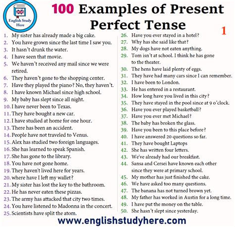100 example of present perfect tense