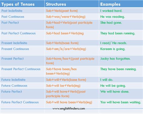different types of tenses and structures with examples