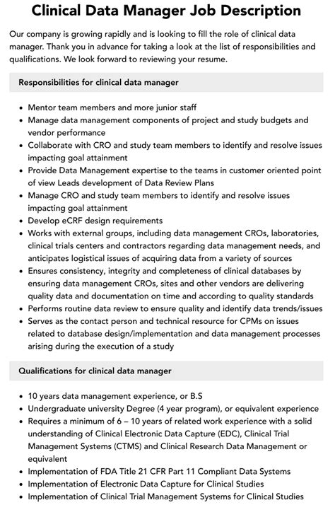 job description for clinical data manager